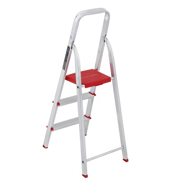 O produto é uma Escada em Alumínio de uso doméstico voltado para atividades corriqueiras do dia a dia em alturas consideráveis. Exemplos: a troca de lâmpadas, instalação de chuveiros elétricos e alcançar compartimentos altos. Trata-se de um artigo do tipo dobrável e portátil, que também possui um revestimento em alumínio, tornando-o leve e resistente contra ferrugens e oxidações. A peça possui pés revestidos com borracha antiderrapante que deixam a escada fixa e impedem movimentos involuntários e acidentais. Ela também têm degraus com frisos antiderrapantes que incrementam a segurança da subida. O equipamento possui 62 cm de altura, haste de 44cm que traz mais segurança ao utilizar o último degrau e suporte o peso de até 120 kg. Ou seja, com ela você pode alcançar alturas consideráveis sem acidentes e com apoio para pesos pesados.